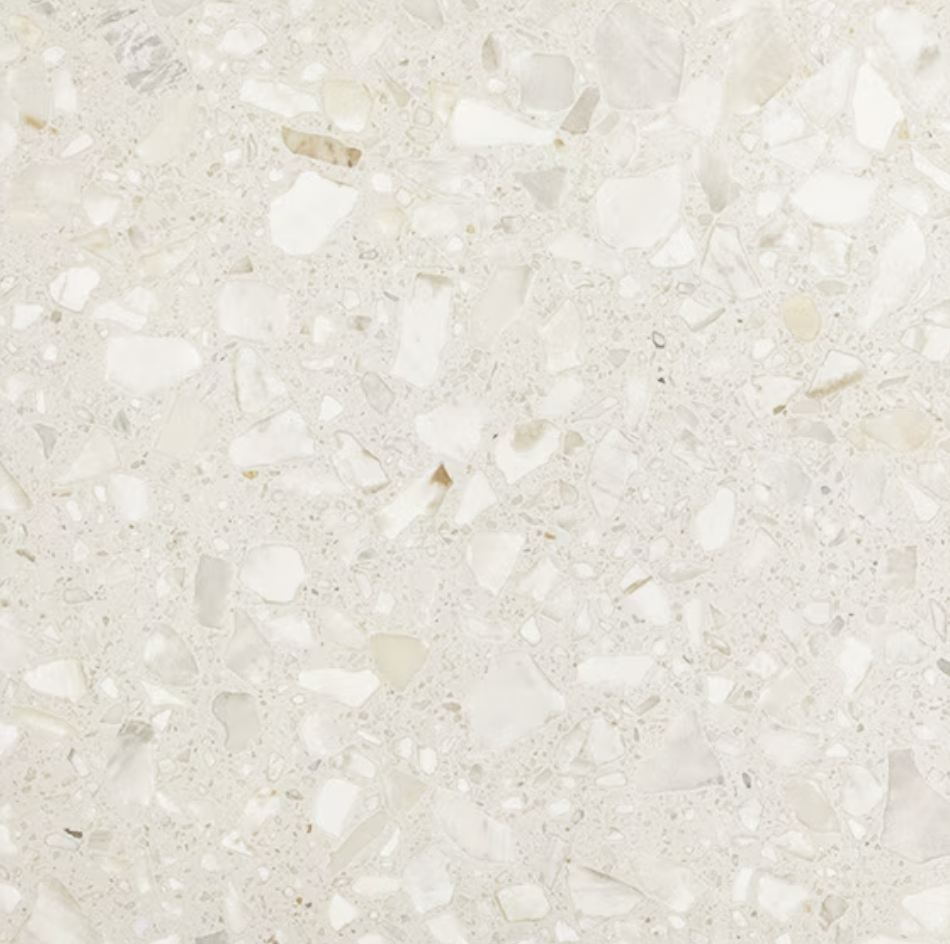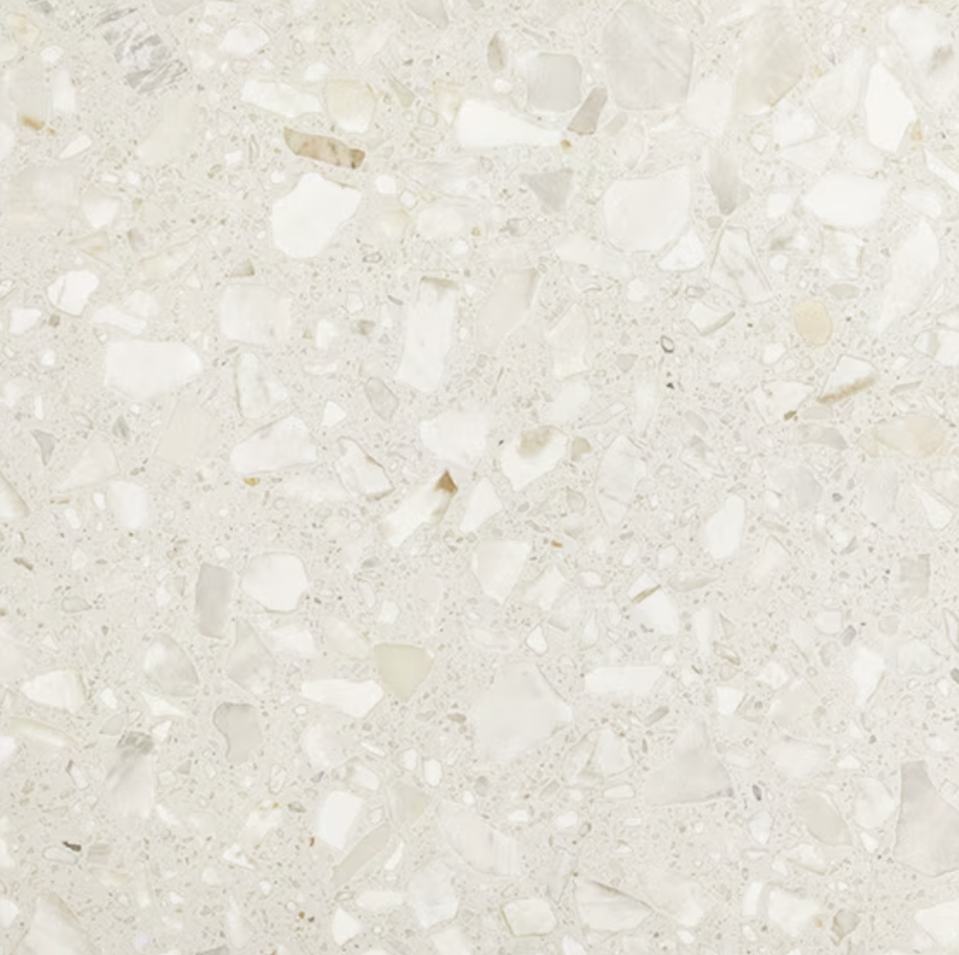The shower is tiled floor to ceiling in handmade ceramic tile that continues to the floor where it changes to a checkerboard pattern. The flooring throughout the rest of the space is a medium format neutral-colored terrazzo. It’s easy to maintain as the floor, including the shower, is all one level.