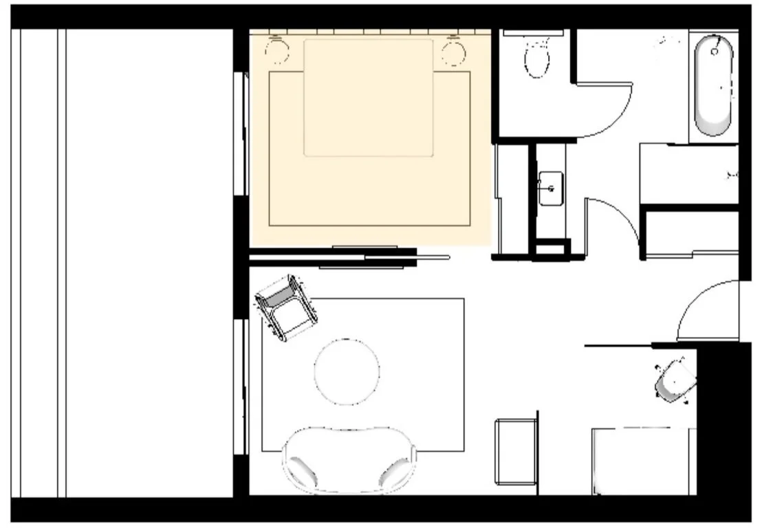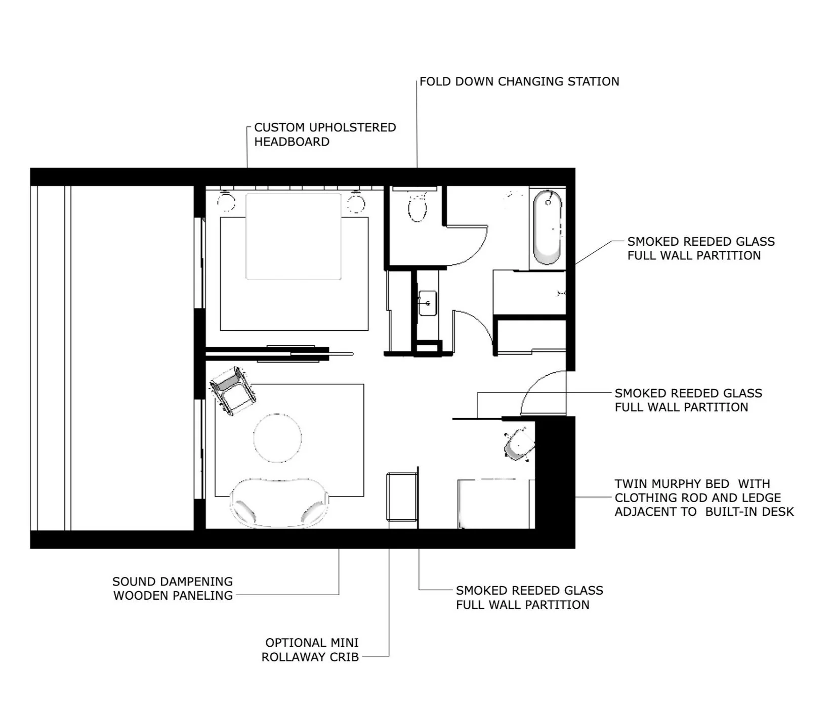 It needs to accommodate those traveling without children as well so it needs to feel high-end, have a workspace, lounge area, and comfortable bedroom and bath.