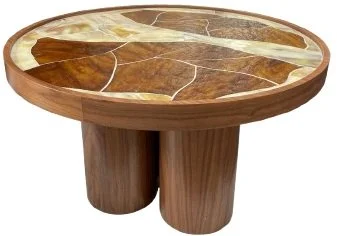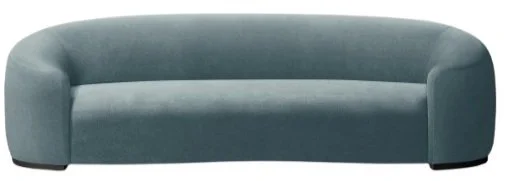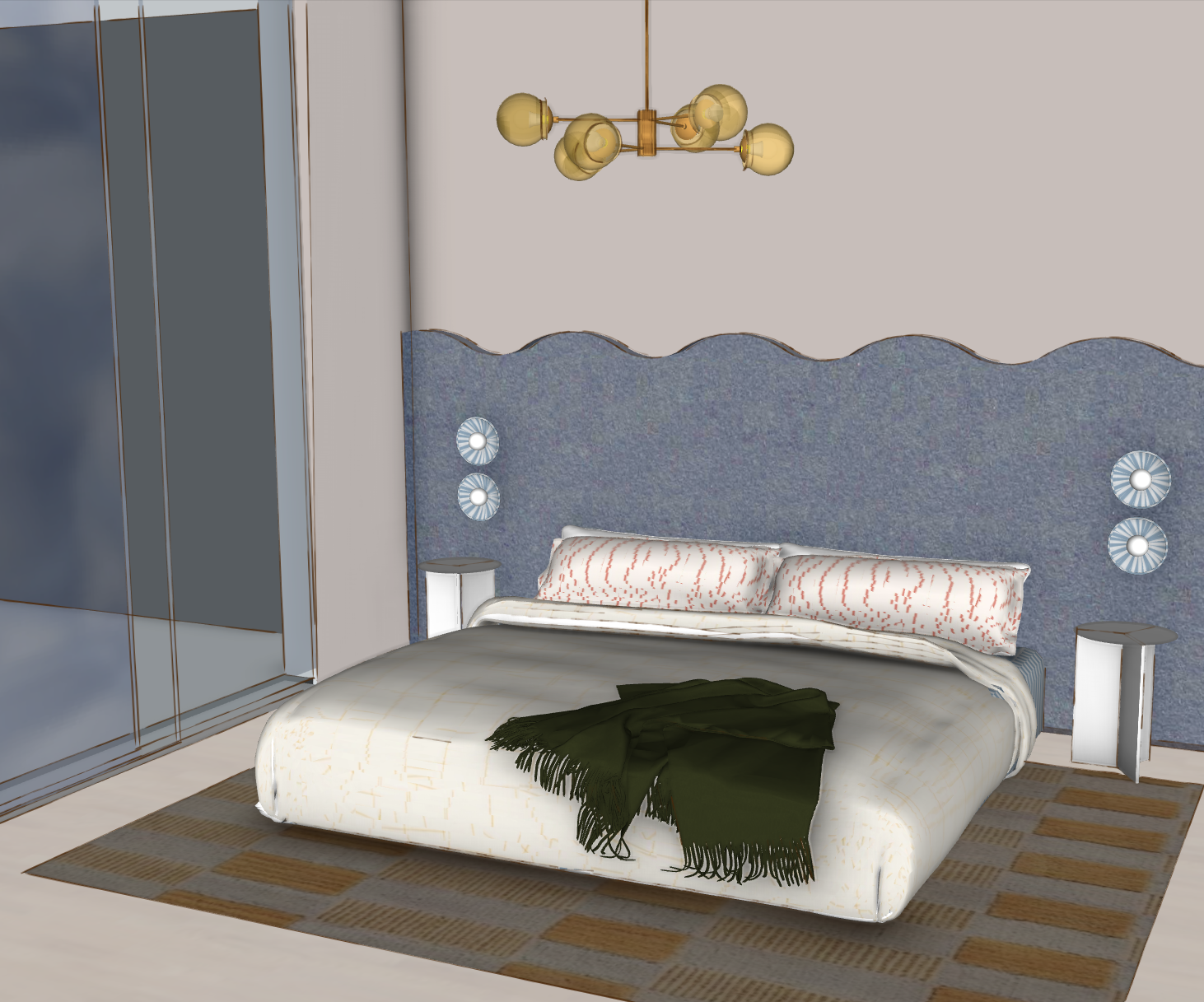 Bed frame is a custom built low box base in Mahogany accompanied by a custom upholstered wavy edge headboard (nod to the Pacific Ocean) in a dark slate blue contract grade velvet.